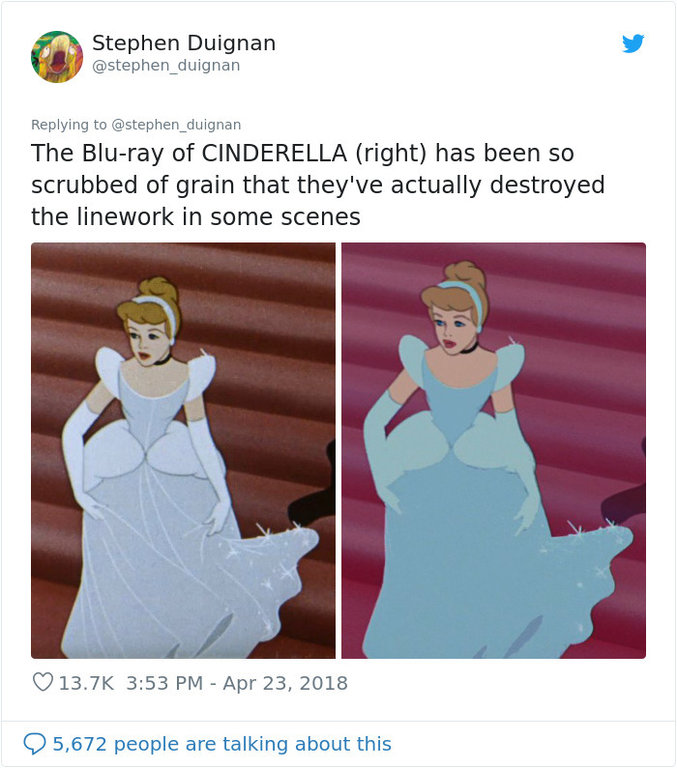 I mean it's not a bit of tampering, it is very dramatic and is in every frame of their movies. Their movies have a soft, unfocussed, and outright unnatural appearance in any of these HD modifications.“Reanimated” is a misleading exaggeration. This is not an abomination like what Warners once did to many of their B&W Looney Tunes. Disney did not bring in a team of evil animators to trace over or destroy the work of the Nine Old Men (who generally felt that some of some of their detail was lost in the original ink and paint process anyway ). Some remasters are better than others. The Cinderella dress example you give is the worst offender and deserves to be called out.