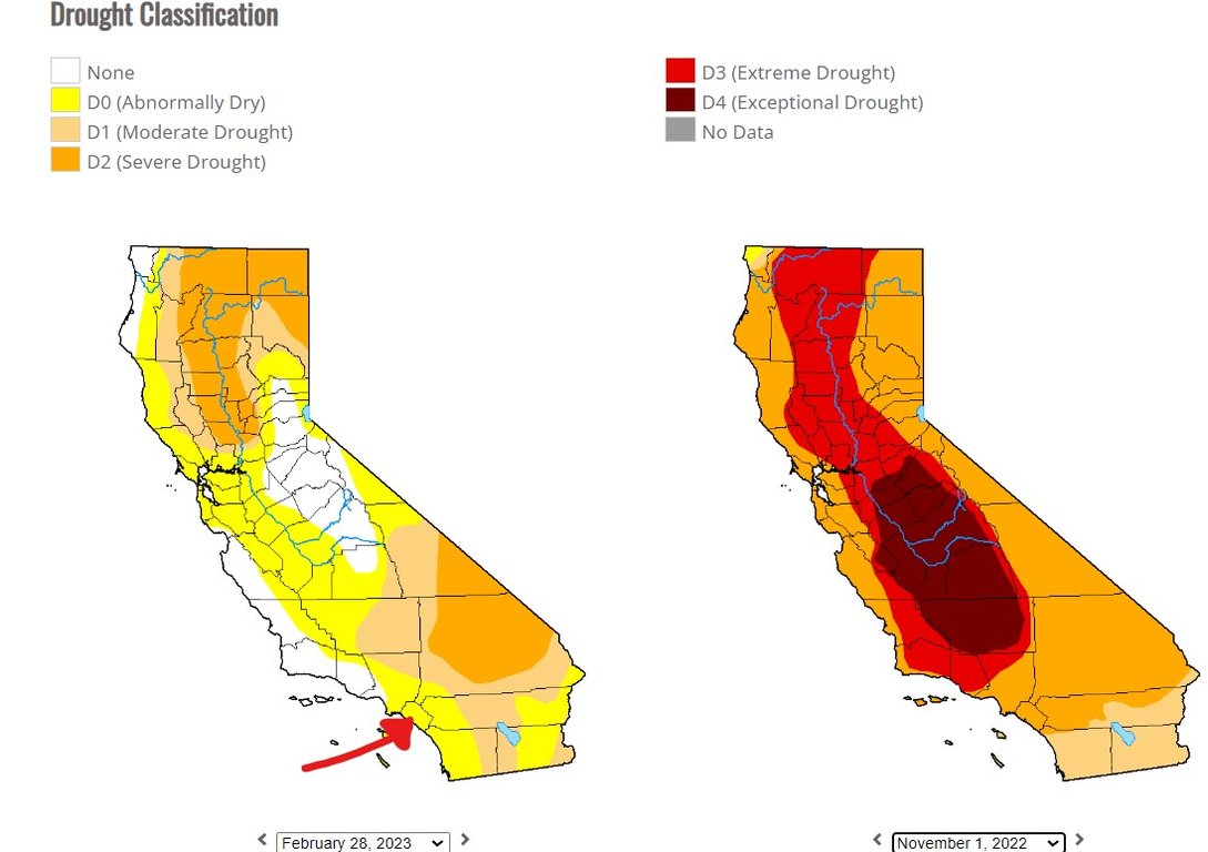 More good news arrived today from the US Drought Monitor for all of Disneyland's trees and mature landscaping. Orange County has now entirely been taken out of Short Term and Long Term Drought status, and is now merely "Long Term Abnormally Dry". The rain totals for these maps are always several days behind and don't take into account all the rain OC and SoCal got in the last five days yet. And with more rain forecast for later in March, even if it's just another inch or two, OC will likely become entirely normal like much of LA, Ventura and Santa Barbara counties have just become.