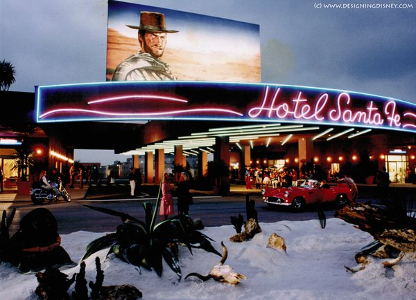 I actually don't mind the Santa Fe. The architecture is at least an interesting attempt at being evocative rather than literal. When the buildings are all lit up at night, I think it is actually quite atmospheric and transportive from cold, wet France! One element that I think might be worth retiring is the "movie screen" billboard. I don't think the effect really comes across, and they don't refresh it nearly enough which means the first impression of the hotel is inexplicably a faded, dirty giant image from Cars.