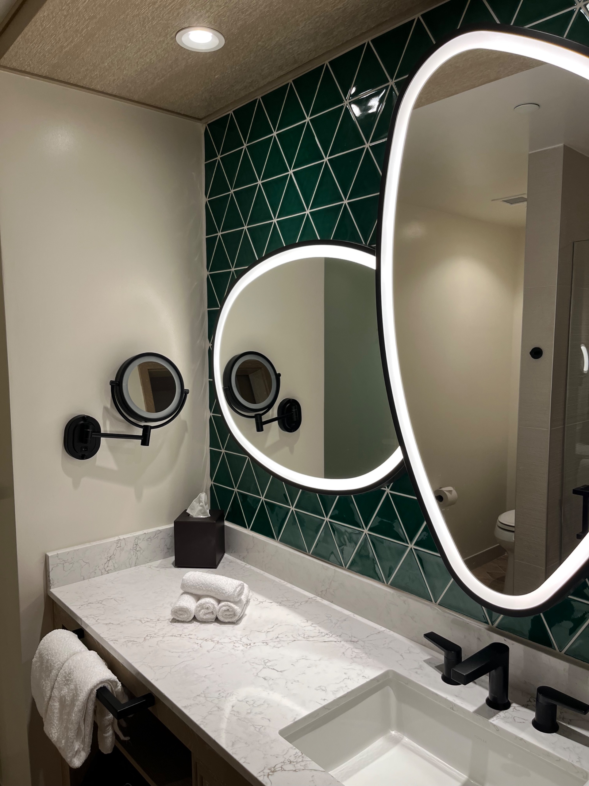 There wasn’t a lot of counter space. The mirrors (and the bathroom in general) gave me Contemporary Resort vibes, rather than Polynesian.