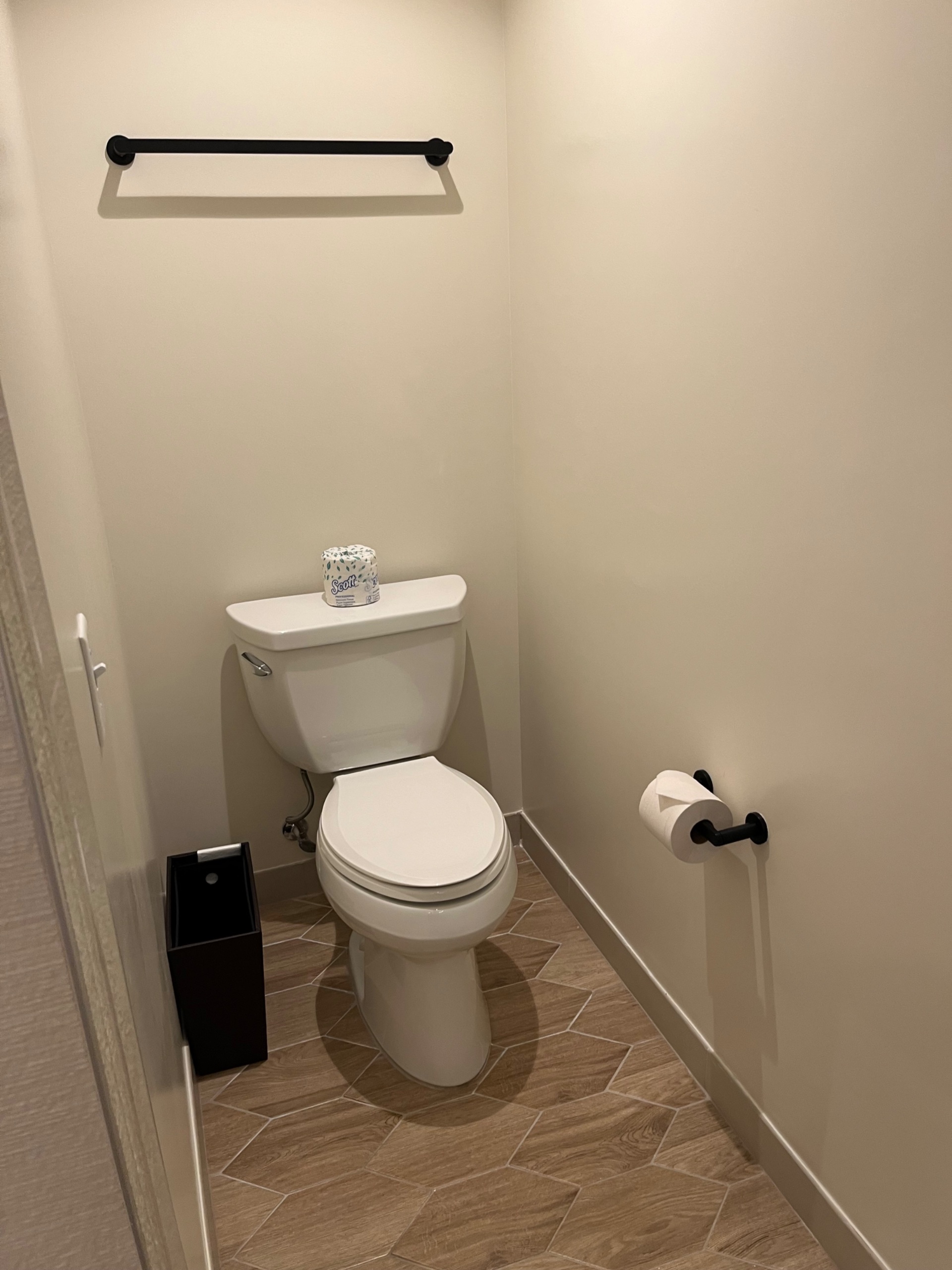 The toilet was next to the shower and had an opaque door, which felt more creepy than private. (There was a barn door which covered the entire bathroom entry, but barn doors can be cumbersome.) This "water closet" is so blah - and why are there no towels on the towel rack?!