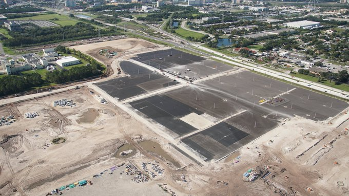Aerial view of what is likely to be partly for construction parking of Universal's Epic Universe. This area, adjacent Sand Lake Rd, is long-approved for office buildings, warehouses, that will support all of the Universal Orlando Resort.