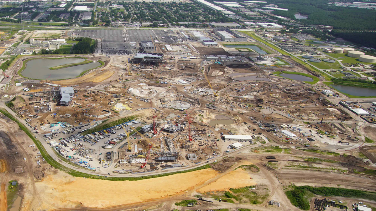 At right, aerial overview of Super Nintendo World. Top left is the central area of Epic Universe. Excavations for a large circular fountain basin, and an attraction that overlaps a semi circular pond. Another large water feature seems to be taking shape nearby.