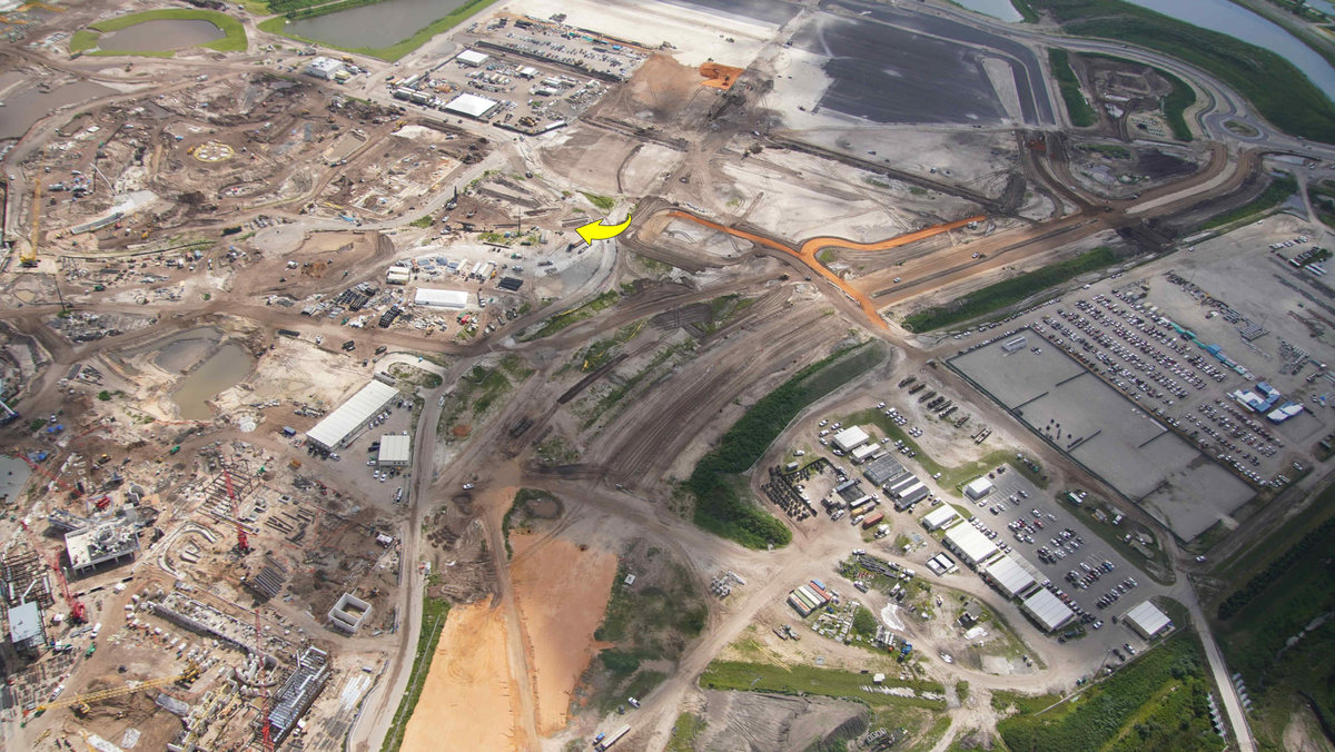 At center of this aerial photo is yellow barrier for an upcoming concrete pour for a floor inside Donkey Kong. In Super Nintendo World in Epic Universe. Note also the depth of the excavation top left.