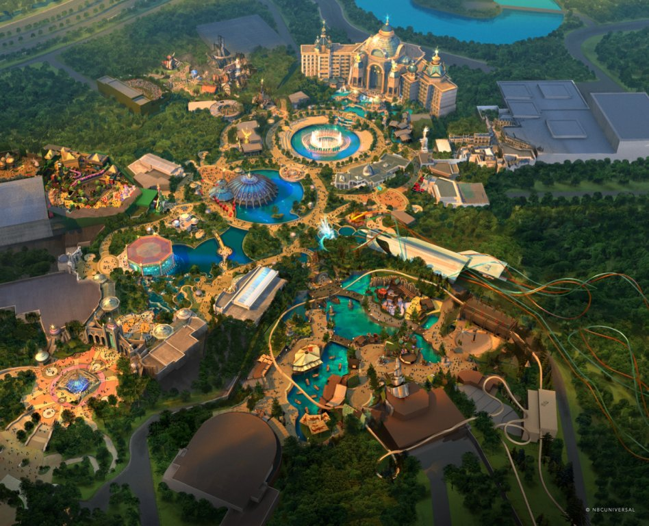 Aerial overview of the Epic Universe dual-racing roller coaster.