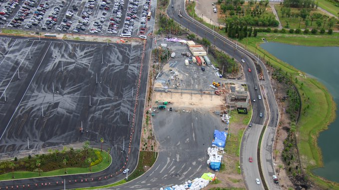 Aerial look at development of the toll plaza for day guest parking at Epic Universe. Arrow as the traffic flow.Vehicles at right are exiting from one of the parking sections now in use by construction team. This will also be day guest exit from that section.