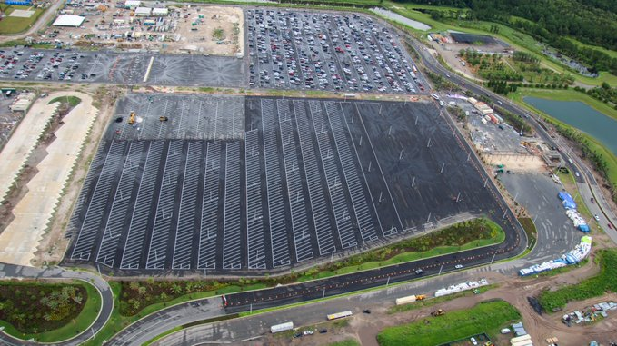 Aerial look at a section of Epic Universe day guest parking being refreshed.Note the difference in lines. Top left portion is Herringbone style, like in a shopping plaza.New lines in traditional theme park style. The section at top of the photo redone like this weeks ago.