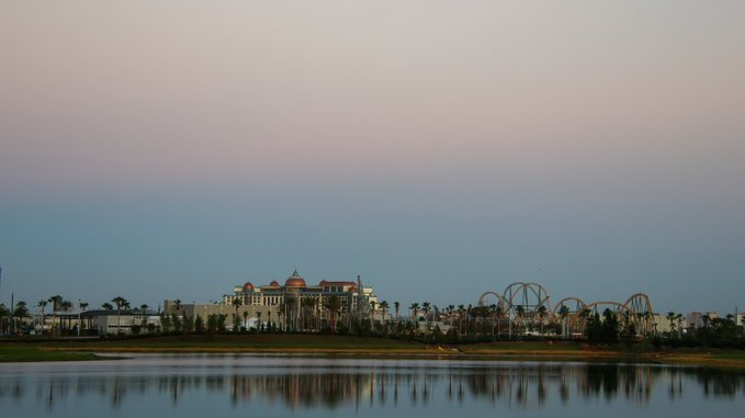Frankenstein Manor's tower, and the Epic Universe entrance tower (Chronos). at sunrise.