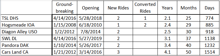 Diagon Alley / Wizarding World Phase 2 was announced in 2012, and opened by 2014. These are highly immersive lands too.