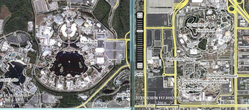 This is always a handy photo for comparing resorts. This is Epcot and DLR at the same zoom level: