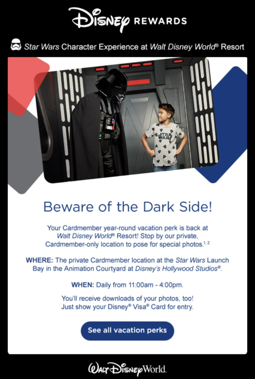 I believe the Disney Visa Cardholder-Exclusive meet and greet with Darth Vader reopened within the last couple of weeks, but don't see it posted here. Disney Rewards sent out this e-mail today.