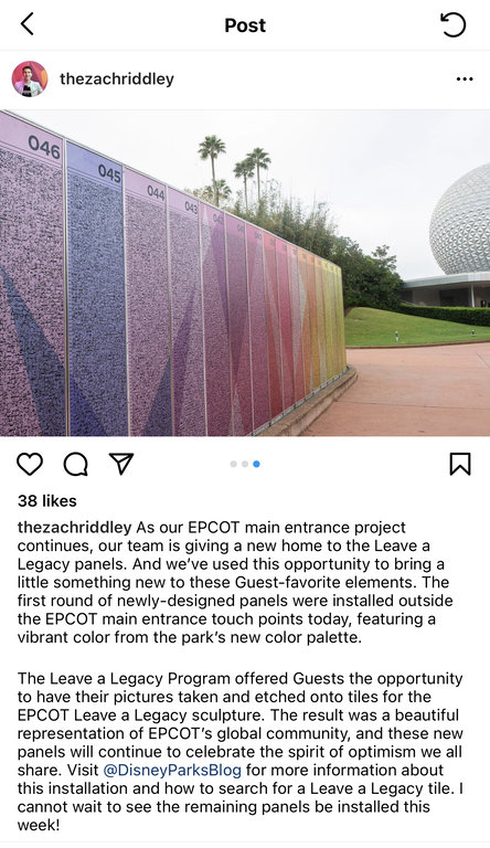 Zach Riddley on Instagram: "As our EPCOT main entrance project continues, our team is giving a new home to the Leave a Legacy panels. And we’ve used this opportunity to bring a little something new to these Guest-favorite elements. The first round of